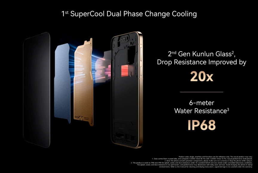 The HUAWEI Mate 80 Pro introduces a new Super Durable Architecture, designed to reinforce every layer of the device without compromising on its premium finish. At the front, 2nd Generation Kunlun Glass incorporates high-strength nanocrystals to deliver up to 20 times greater drop resistance than conventional glass, helping protect against everyday impacts.